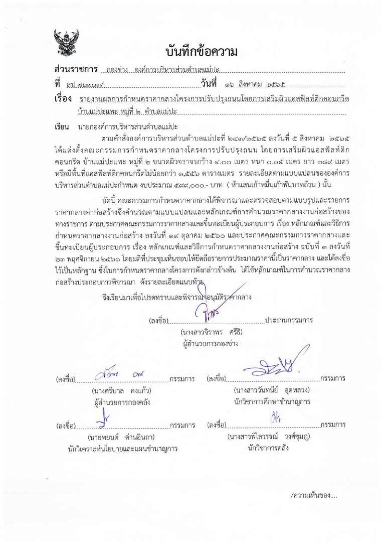 รายงานผลการกำหนดราคากลางโครงการปรับปรุงถนนโดยการเสริมผิวแอสฟัลท์ติกคอนกรีต บ้านแม่ปะแพะ หมู่ที่ ๒ ตำบลแม่ปะ.