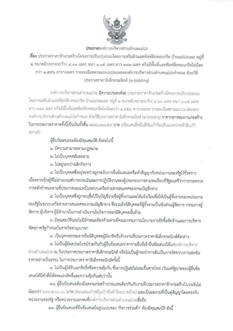 ประกวดราคาจ้างก่อสร้าง โครงการปรับปรุงถนนโดยการเสริมผิวแอสฟัลท์ติกคอนกรีต บ้านแม่ปะแพะ หมู่ที่ ๒ ตำบลแม่ปะฯ (e-bidding)