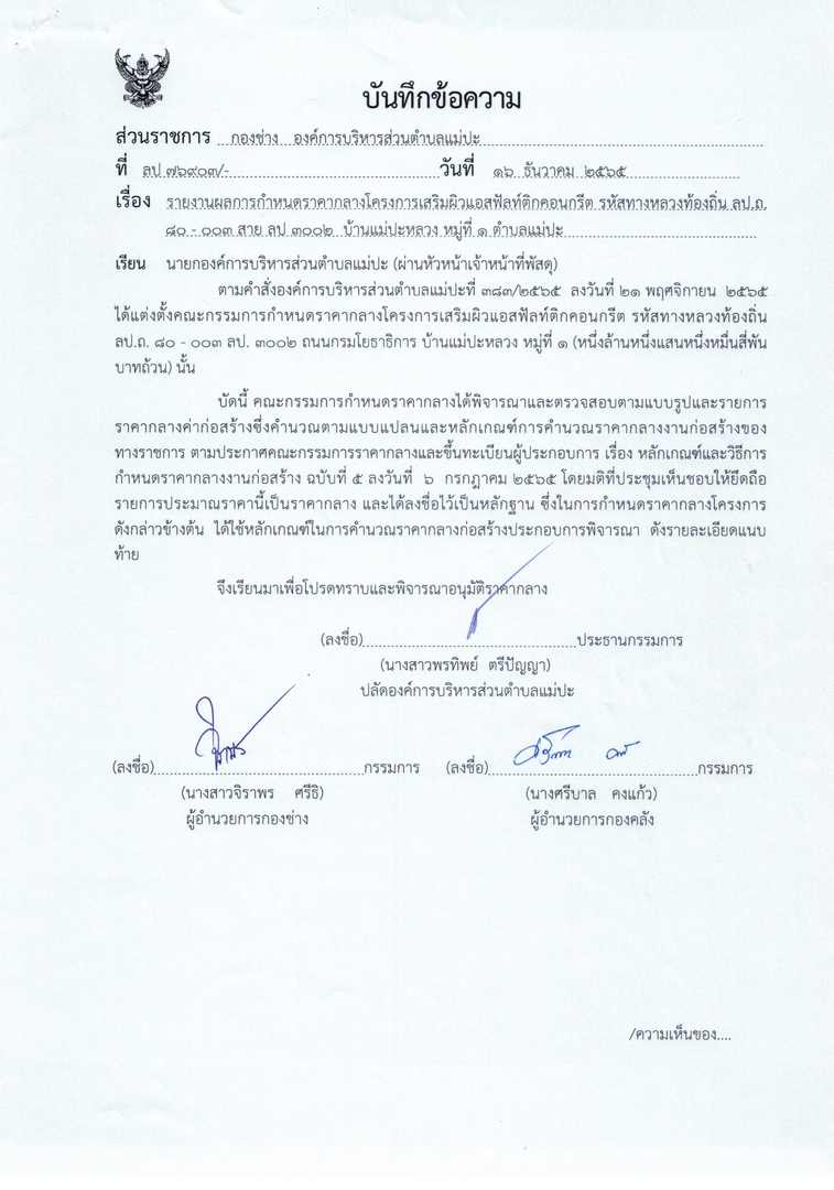 รายงานผลการกำหนดราคากลางโครงการเสริมผิวแสฟัลท์ติกคอนกรีต รหัสทางหลวงท้องถิ่น ลป.ถ.๘๐-๐๐๓ สาย.ลป.๓๐๐๒ บ้านแม่ปะหลวง หมู่ที่ ด ตำบลแม่ปะ