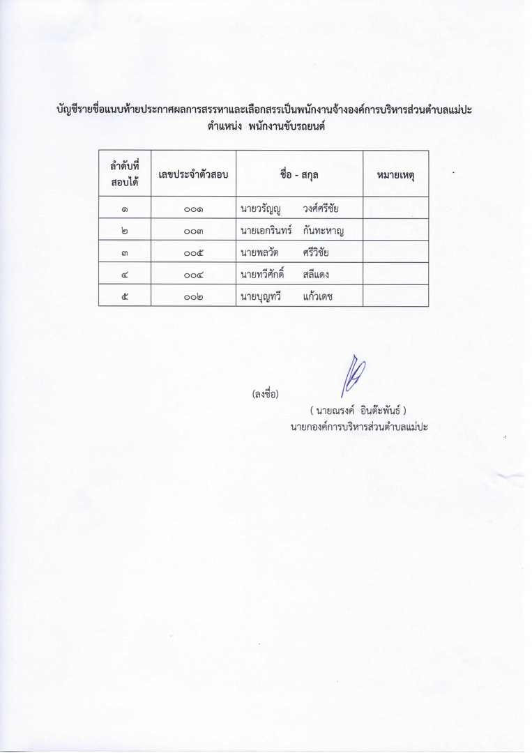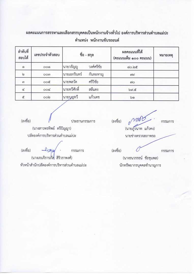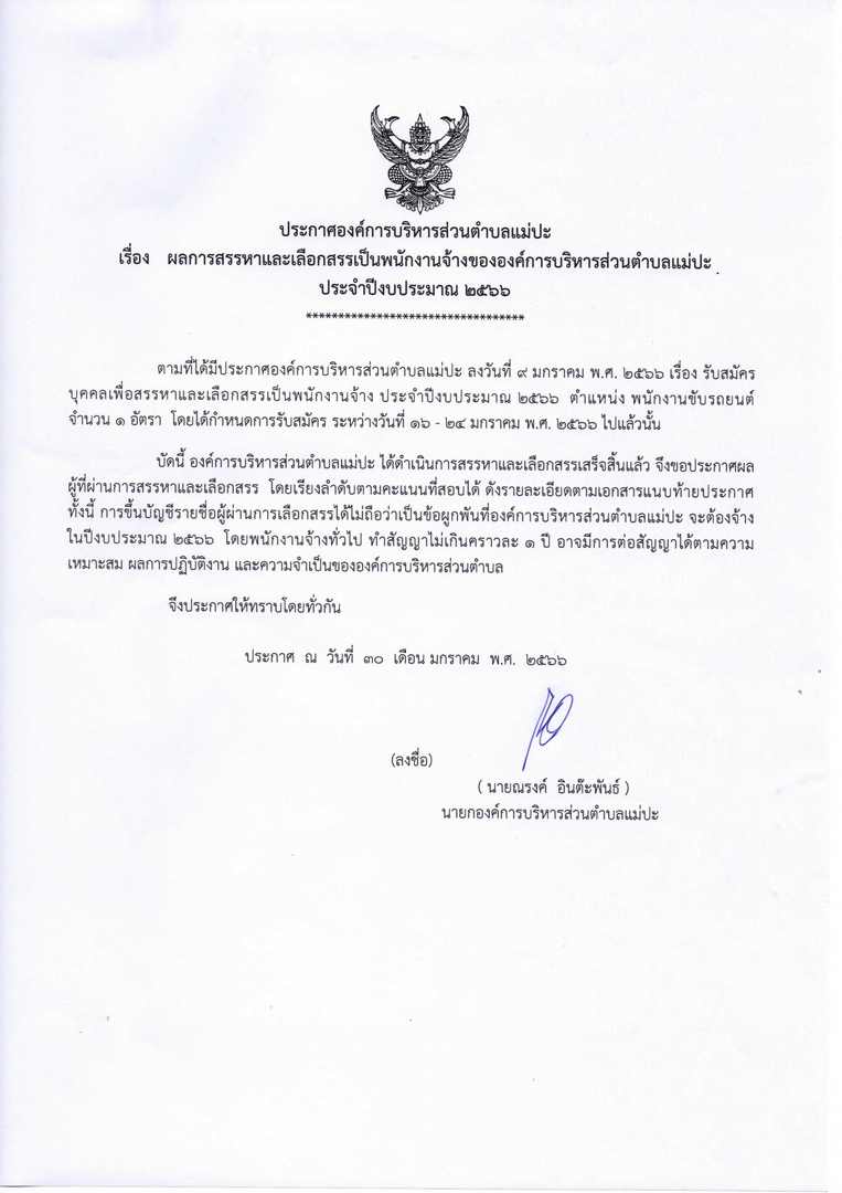 ผลการสรรหาและเลือกสรรเป็นพนักงานจ้างขององค์การบริหารส่วนตำบลแม่ปะ ประจำปีงบประมาณ ๒๕๖๖