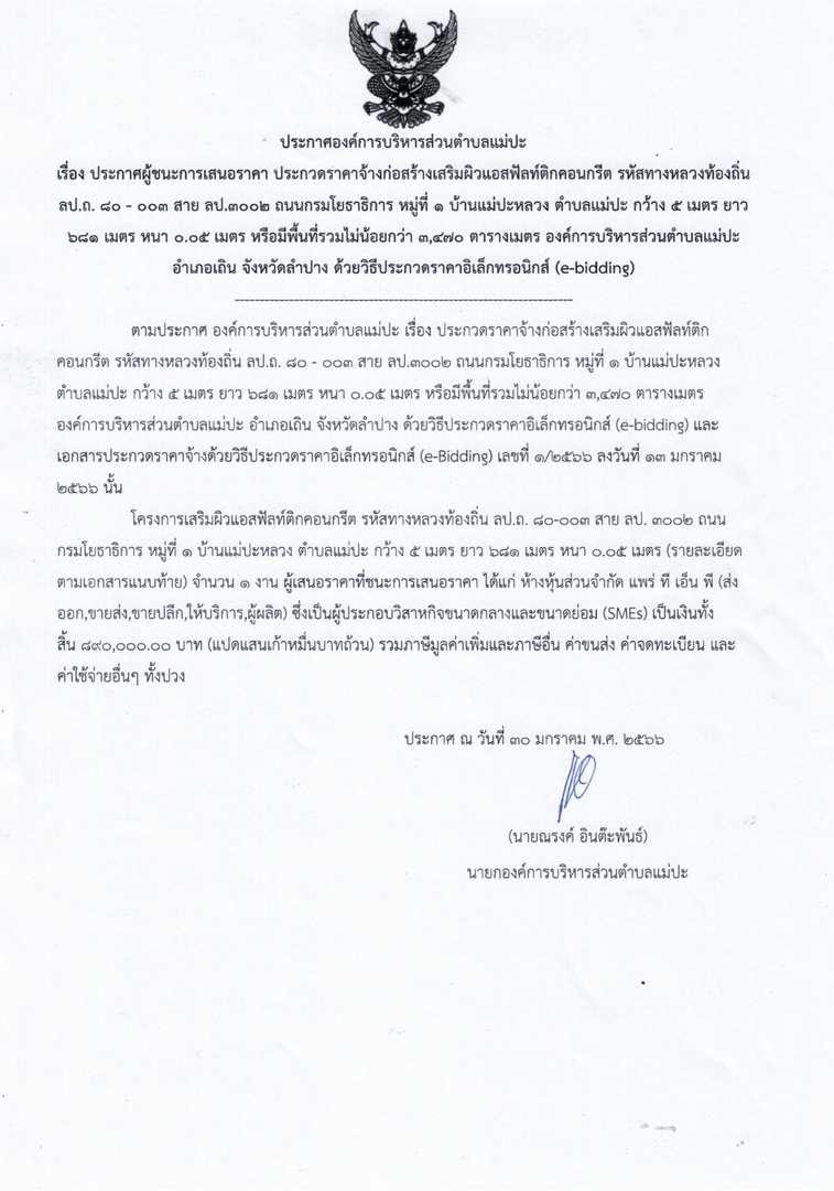 อำเภอเถิน จังหวัดลำปาง ด้วยวิธีประกวดราคาอิเล็กทรอนิกส์ (e-bidding)