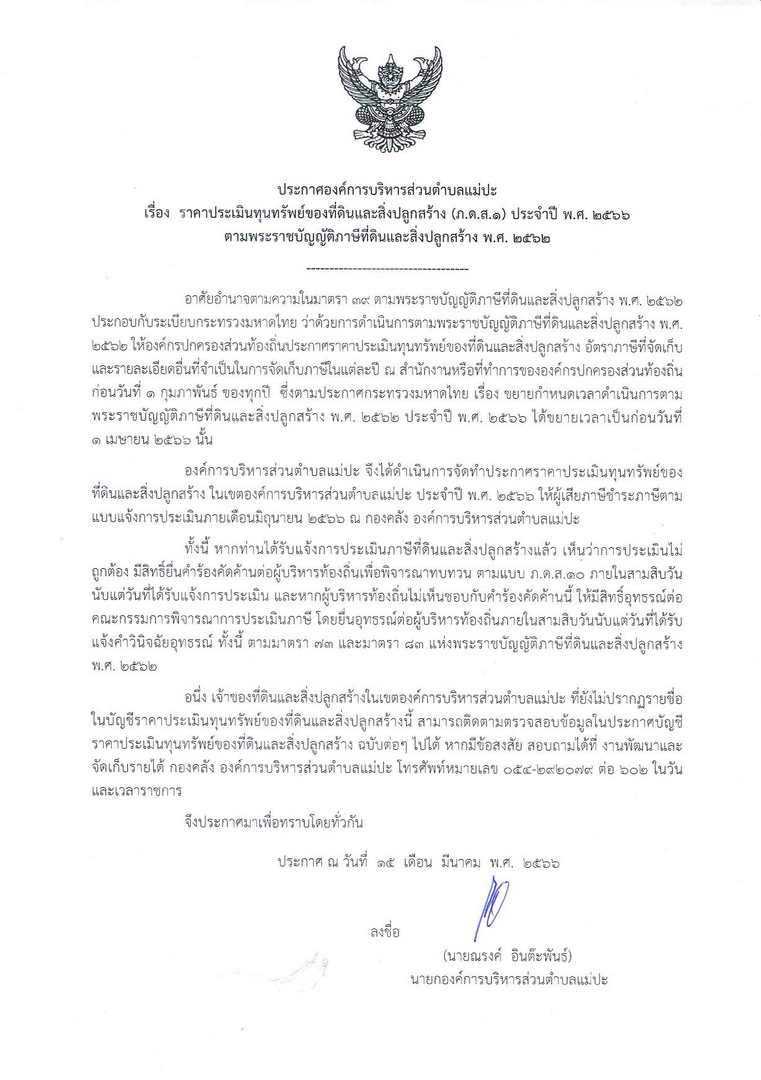 ราคาประเมินทุนทรัพย์ของที่ดินและสิ่งปลูกสร้าง (ภ.ด.ส.๑) ประจำปี พ.ศ. ๒๕๖๖ ตามพระราชบัญญัติภาษีที่ดินและสิ่งปลูกสร้าง พ.ศ. ๒๕๖๒