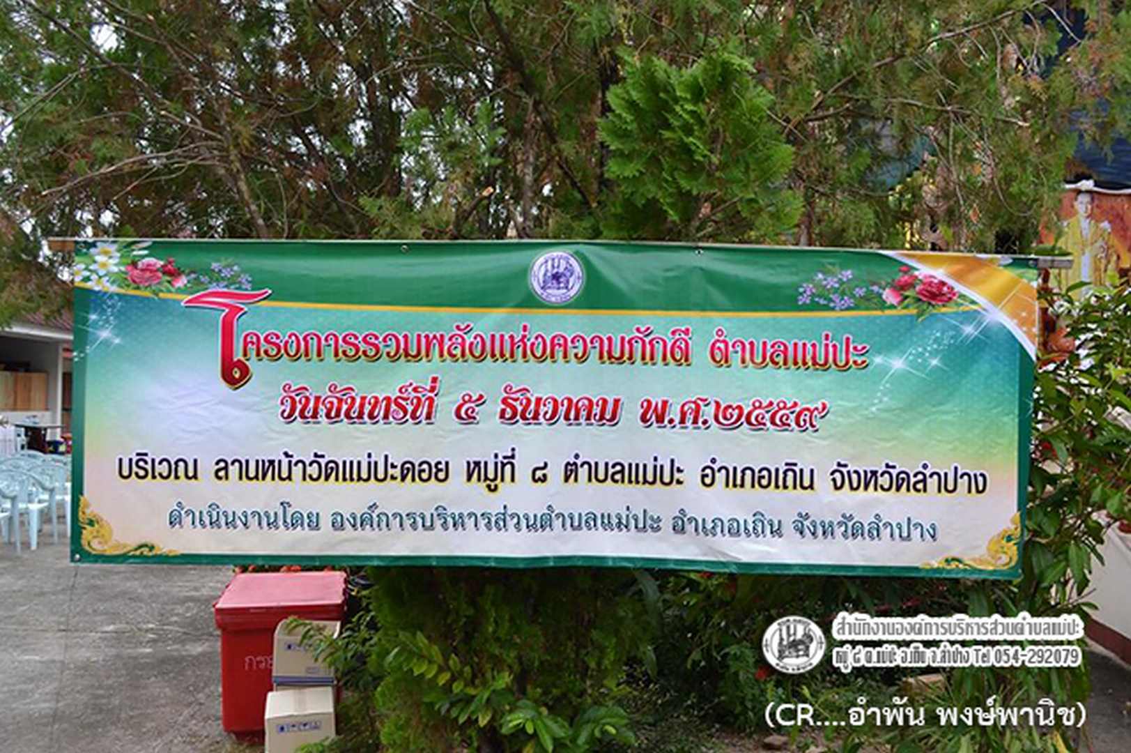 เมื่อวันที่ ๗ ธันวาคม ๒๕๕๙ เวลา ๑๖.๐๐ - ๑๙.๐๐ น. นายมงคล บางขะกุล นายกองค์การบริหารส่วนตำบลแม่ปะ อำเภอเถิน จังหวัดลำปาง นายอาจหาญ อินทราย รองนายกฯ นายนิเวศน์ วันนำ รองนายกฯ น.ส.พรทิพย์ ตรีปัญญา ปลัดอบต.แม่ปะ นางเจนจิรารภัส ศิริวราพงษ์ หน.สป.อบต.แม่ปะ กำนันวินัย เชียงทอง กำนันตำบลแม่ปะ นำข้าราชการ กำนัน - ผู้ใหญ่บ้าน พ่อค้า ประชาชน เข้าร่วมพิธีรำลึกในพระมหากรุณาธิคุณและถวายความอาลัยพระบาทสมเด็จพระปรมินทรมหาภูมิพลอดุลยเดช และร่วมร้องเพลงสรรเสริญพระบารมี ณ วัดแม่ปะดอย อ.เถิน จ.ลำปาง(ภาพ:ข่าว องค์การบริหารส่วนตำบลแม่ปะ ลำปาง)(CR....อำพัน พงษ์พานิช)